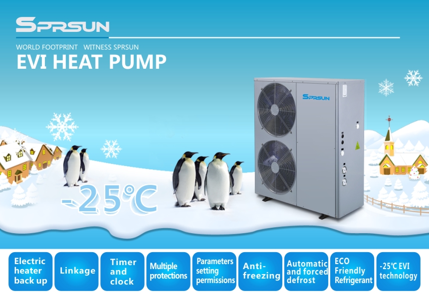 Sprsun EVI havo manbali issiqlik pompasi, ayniqsa, eng past havo harorati -25 ℃ ga yetadigan sovuq hududda maishiy issiq suv va uyni isitish uchun mo'ljallangan. Batafsil mahsulot xususiyatlari uchun bizning ko'ring EVI havodan suvga issiqlik nasoslari.